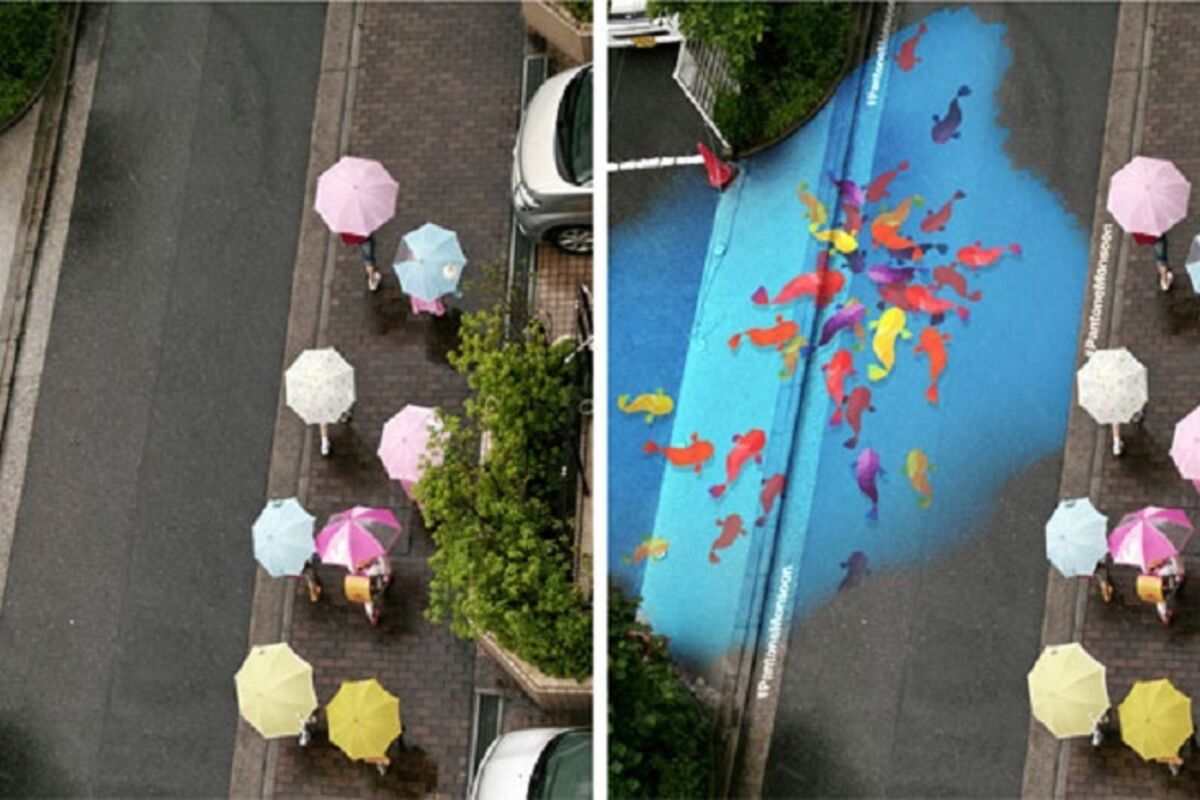 Ova kreativna saradnja nastala je između lokalnih uličnih umetnika i proizvođača koji su ih snabdeli hidrohromatskim bojama koje su nevidljive sve dok ne padne kiša.