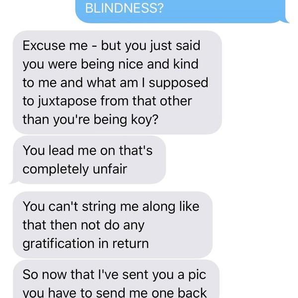 Izmenili su još nekoliko poruka i nakon što mu je ona rekla da se ne može više dopisivati i da mora da ide, Hank joj je poslao fotografiju svojih genitalija. Tamira je, očekivano, ostala u šoku.