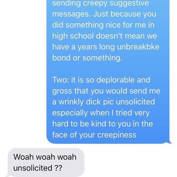 Napisala mu je kako joj nije imao pravo poslati takvu poruku te da je užasno to što joj šalje takvu fotografiju nakon što je ona sve vreme bila ljubazna prema njemu i na lep način mu pokušala objasniti da nije zainteresovana za vezu s njim.