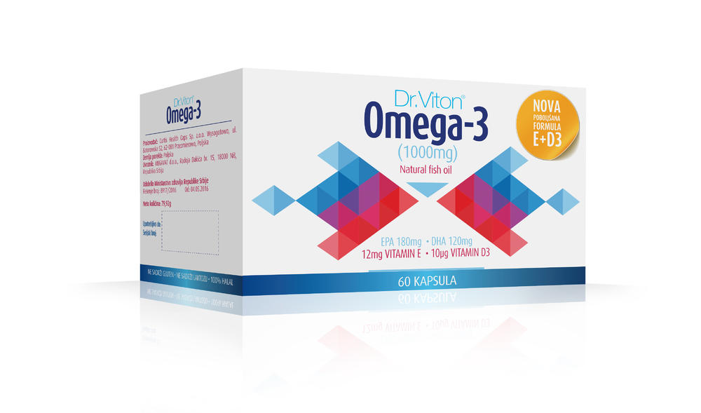 Dr. Viton Omega3+ 12mg VitE+ 10mcg VitD3 se preporučuje u cilju poboljšanja opšteg stanja organizma, podizanja imuniteta, regulisanja nivoa masnoća u krvi, povoljnog uticaja na hipertenziju, smanjenja rizika od ateroskleroze pa samim tim i očuvanja srca i krvnih sudova. Povoljno utiče na nervni sistem, smanjenje depresije, reumatske bolesti, kao i kod prevencije osteoporoze, štiti od demencije i doprinosi očuvanju kognitivne funkcije. Omega 3 možete kupiti OVDE, po ceni od samo 396 rsd, za 60 tableta, ili pozivom na broj telefona 011/4420-502 radnim danima.