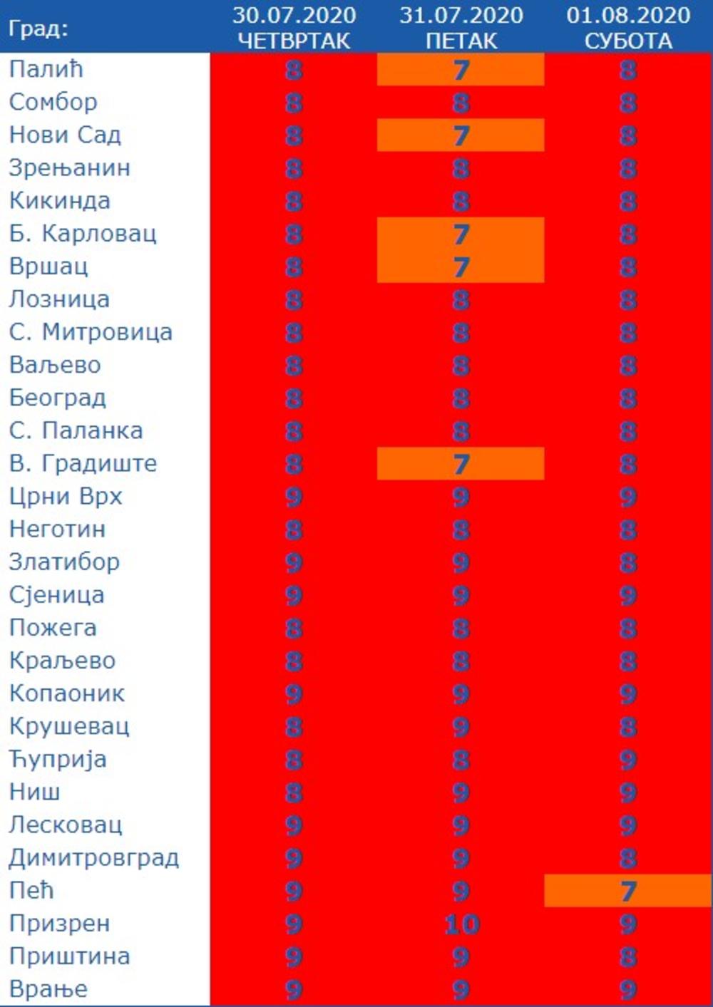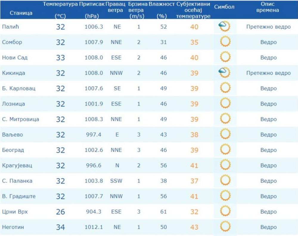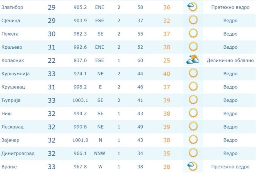 Trenutno je najtoplije u Negotinu, gde je do 13 časova izmereno 34 stepena, naveo je RHMZ. U Novom Sadu, Kuršumliji, Ćupriji i Vranju izmerena su 33, dok je u Beogradu 32 stepena.