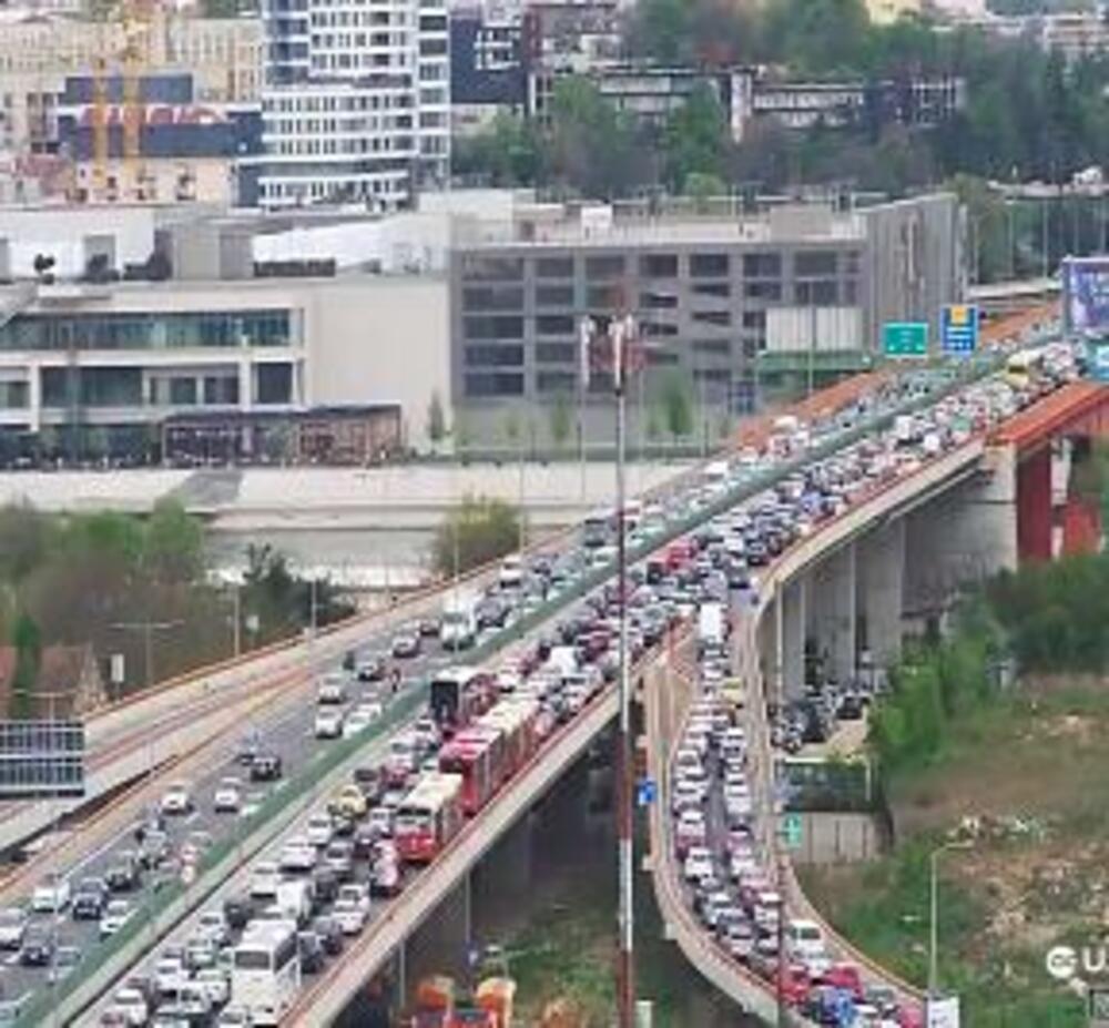 Kolaps je i na Bulevaru Mihajla Pupina , kolone ka Brankovom mostu su ogromne. Na samom Brankovom mostu ima puno vozila, ali se kreću.
