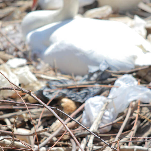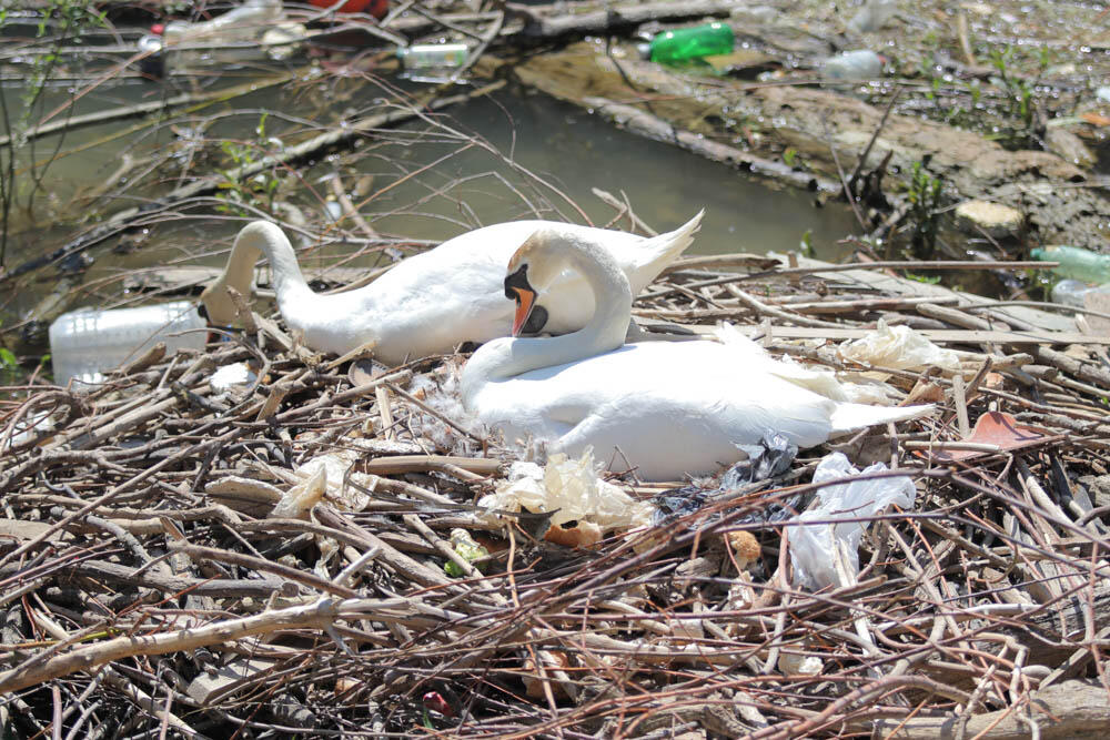 Gnezdo okruženo smećem. Na njemu labud budno posmatra sve oko sebe, dok labudica nepomično leži na jajima.