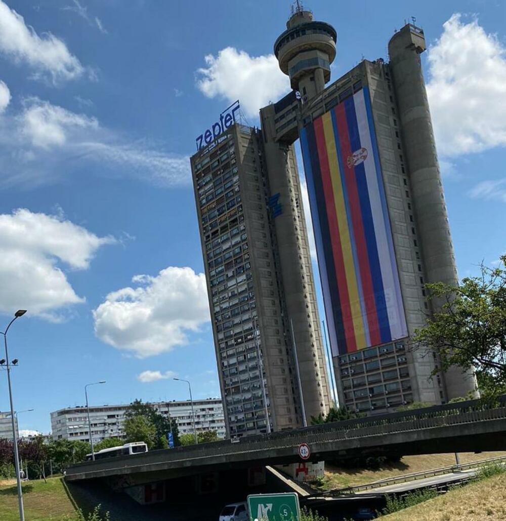 Dve zastave vise jedna do druge celom dužinom kule, a to je uslikao jedan korisnik društvene mreže Instagram, dok su fotografije objavljene na Instagram stranici serbialive_beograd.