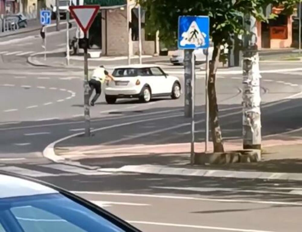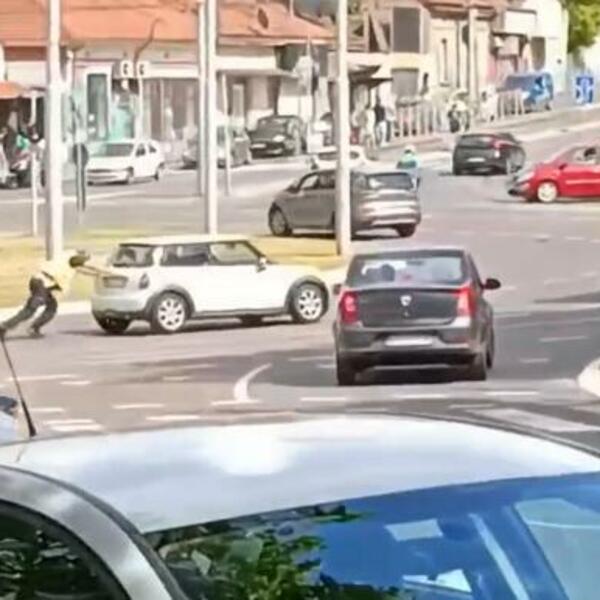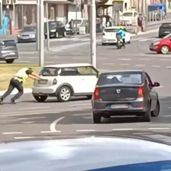 Naime, jednom vozaču auto se ugasio usred kružnog toka, nije mogao dalje, a u pomoć mu je priskočio saobraćajni policajac. On je sam gurao automobil sve dok nije upalio, a neko od prolaznika snimio je šta se događalo.