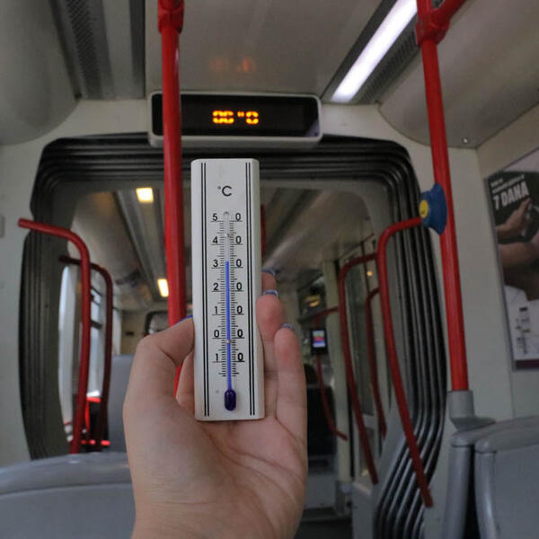Zatim smo odlučili da proverimo kakvo je stanje u tramvaju i ušli smo u 12-ticu koja je bila klimatizovana, ali ne dovoljno. Termometar je pokazao 32 stepena u tramvaju.
