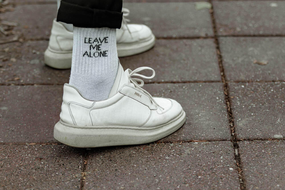 Njegova današnja odevna kombinacija bile su crne pantalone i prugasta košulja, koje decenijama predstavljaju nepogrešiv duo. A ono što nam je posebno izazvalo pažnju su čarape sa natpisom "Leave me alone" iliti na srpskom "Ostavi me na miru".