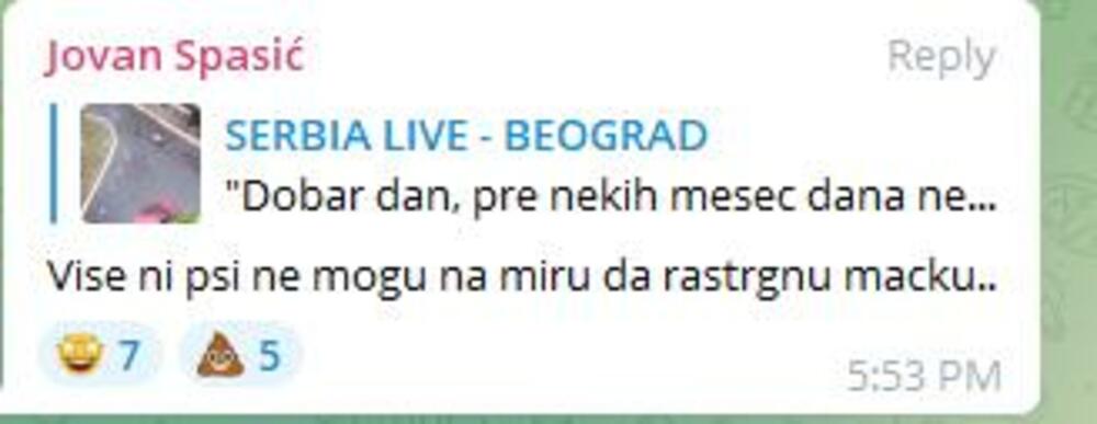 Pre nekih mesec dana nekoliko pasa lutalica je rastrglo mačku koja se nalazila ispred zgrade. Taj dan smo odmah zvali nadležne koji su nam samo rekli "poslaćemo prvu slobodnu ekipu". Naravno da se nisu pojavili. Broj pasa se samo povećao, nasrću na druge pse i na ljude! Agresivni su što se na snimku i vidi.