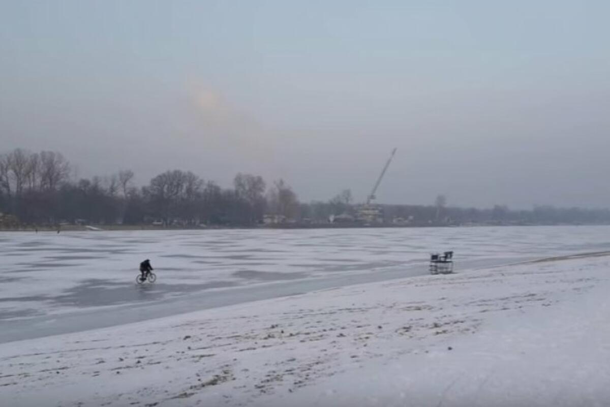 Na internetu je u nedelju osvanuo snimak koji prikazuje nepoznatog muškarca kako vozi bicikl preko zaleđene vode.