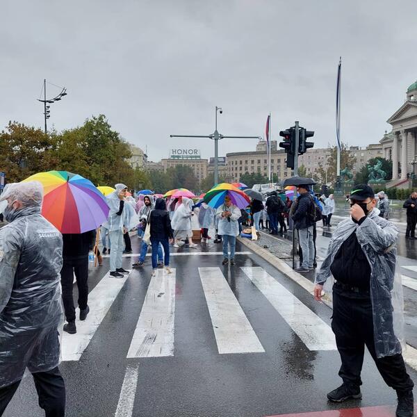Policija je oko 13 sati potisnula manju grupu građana koji nose verska obeležja i protive se održavanju Evroprajda od Glavne pošte niz Takovsku ulicu do zgrade RTS-a. Dvoje demonstranata je privedeno.