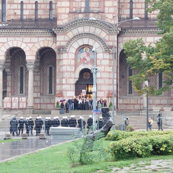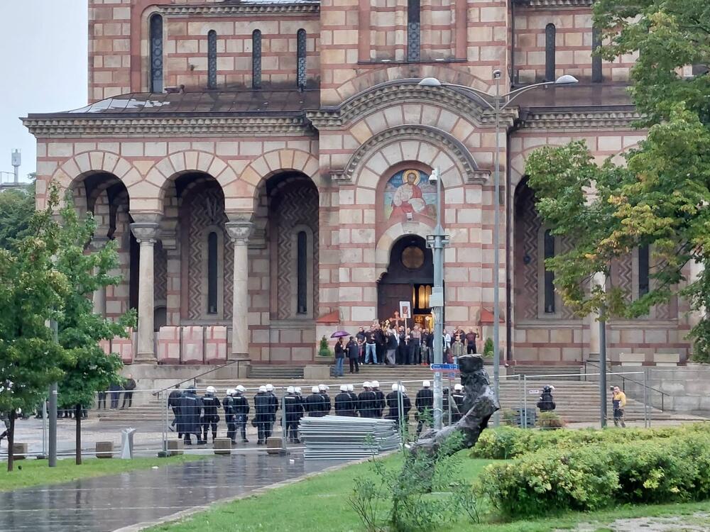 16.46 Ispred Crkve Svetog Marka okupili su se takođe protivnici Prajda, a kako se može videti i policija je na tom mestu