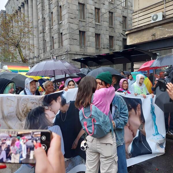 Jedni do drugih - učesnici Prajda sa šaernim kišobranima u svim bojama su u blizini antiglobalista, a razdvaja ih policija. Antiglobalisti uzvikuju da je sve to neprirodno, do učesnici Prajda viču - Pustite nas da živimom kako hoćemo...
