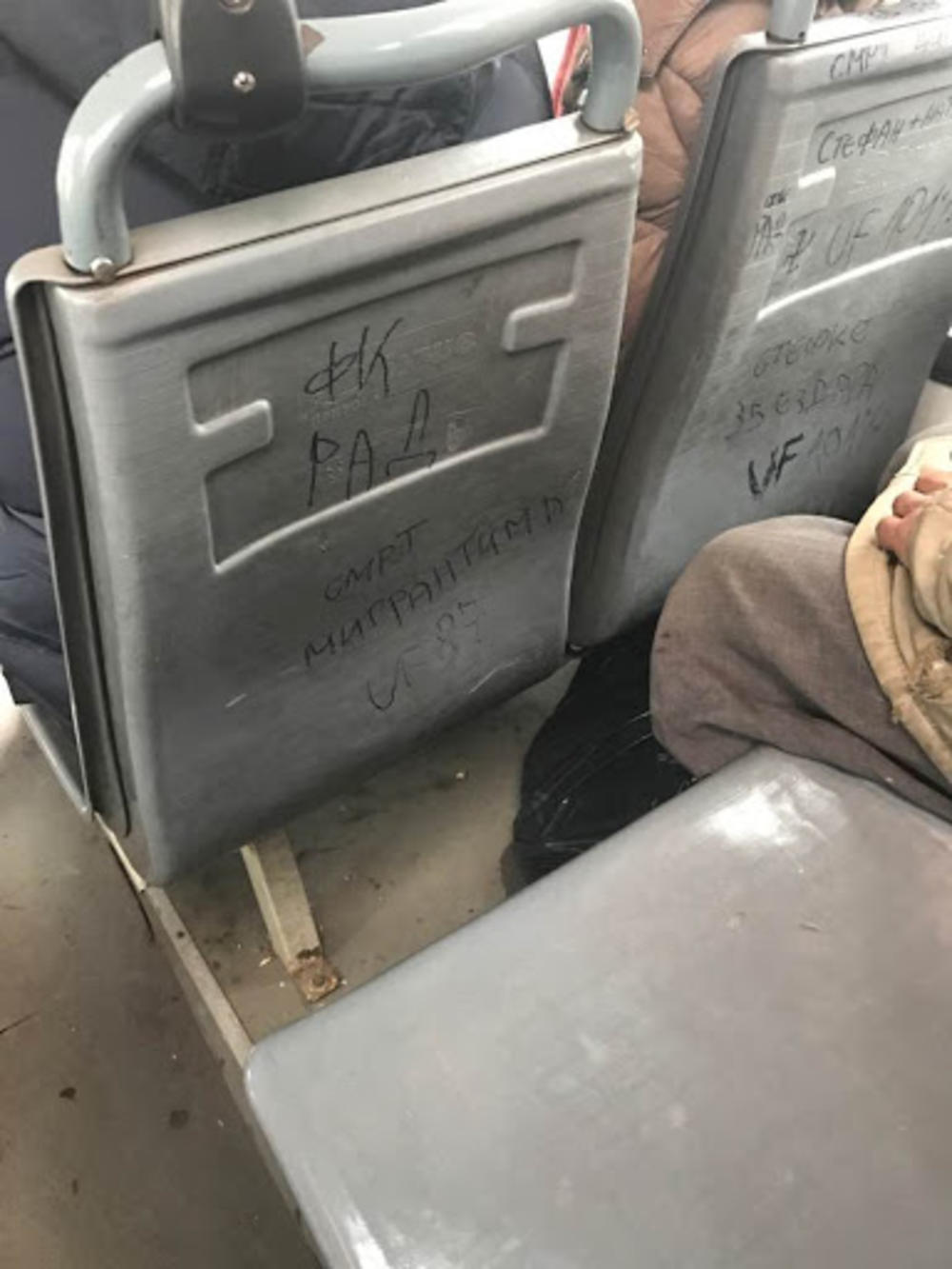 - Smrt migrantima - piše na sedištu. Sedi, na natpis ne obraća pažnju. Mislim se, hvala Bogu pa jezik ne razume. Da se ne deprimira čovek još više - kao da mu njegova muka nije dovoljna.