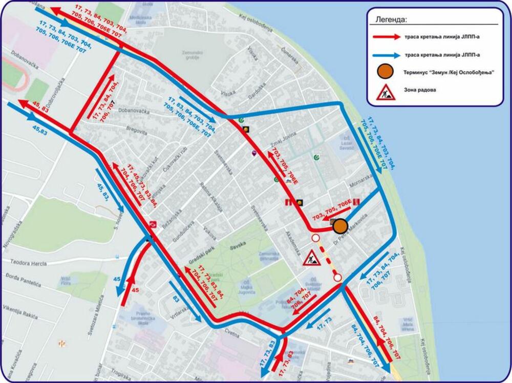 Vozila sa linija 703, 705 i 706E će saobraćati ulicama: u smeru ka Batajnici – Terminus „Kej Oslobođenja“, Marka Nikolića, Davidovićeva, Glavna,Cara Dušana i dalje redovnom trasom; u smeru ka gradu – Cara Dušana, Karamatina, Kej Oslobođenja, do terminusa „Kej Oslobođenja“.