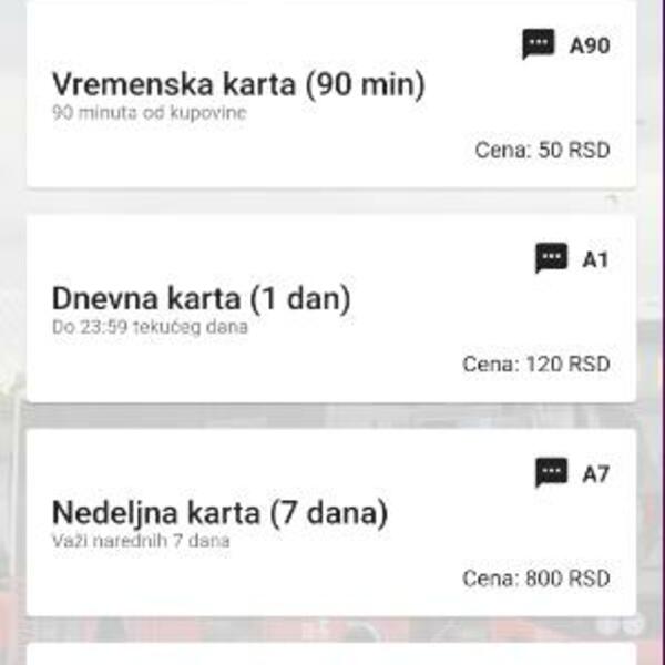 SMS poruke na broj 9011 se šalju u tekstualnoj formi A90 za A zonu. B90 za B zonu i C90 za C zonu. Karta od 90 minuta u Zoni A i B košta 50 dinara, a u zoni C 100 dinara, a dnevna karta u zoni A 120 dinara.