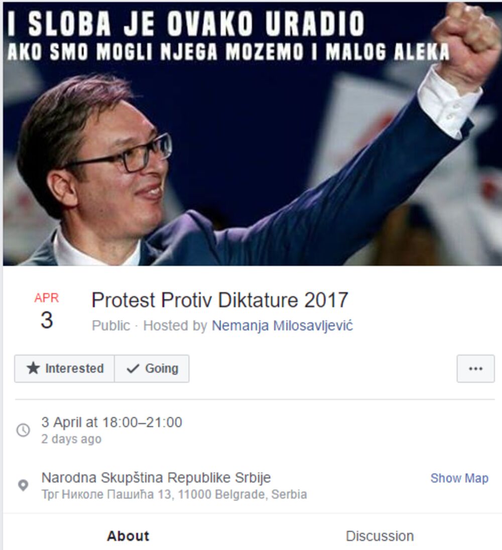 Na ovoj društvenoj mreži je i najava protesta "protiv diktature 2017" pod nazivom: "I Sloba je ovako uradio, ako smo mogli njega, možemo i malog Aleka".
