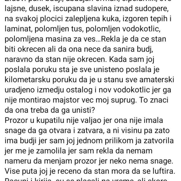 - Isčupana je slavina iznad sudopere, na svakoj pločici zalepljena kuka, izgoren tepih i laminat, polomljen tuš, polomljen vodokotlić, polomljena mašina za veš. Rekla je da će stan biti okrečen ali da ona neće da sanira buđ, naravno da stan nije okrečen. Kada sam joj poslala poruku šta je sve uništeno poslala je kilometarsku poruku da je u stanu sve amaterski urađeno između ostalog i nov vodokotlić jer ga nije montirao majstor već moj suprug. To znači da ona treba da ga uništi? - pita se ona.