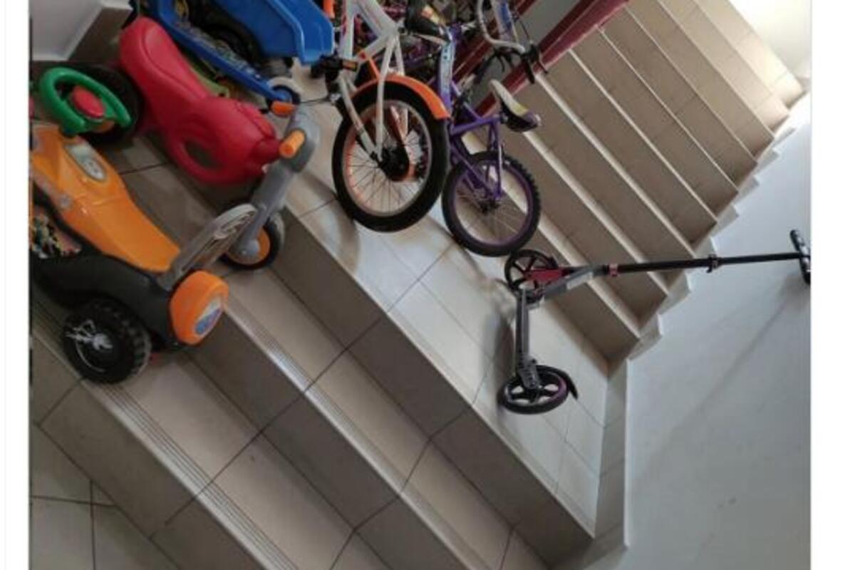 Žena je, očigledno besna zbog onoga što stalno viđa, najpre u hodniku zgrade uslikala nekoliko dečijih plastičnih motora, bicikala i trotineta, koji su, po svemu sudeći zaista zauzeli i više od pola hodnika.