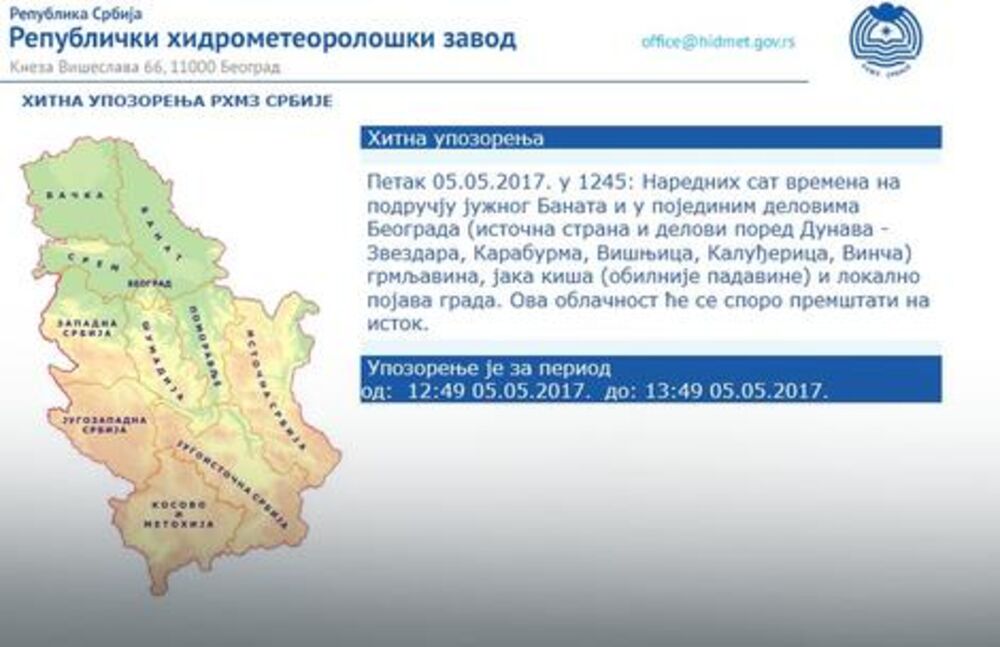 RHMZ je izdao hitno upozorenje za područje južnog Banata i delove Beograda zbog nadolazećeg nevremena koje se očekuje u periodu do 14 časova.