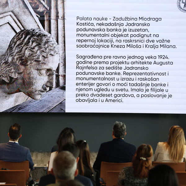 - Zadovoljstvo je učestvovati u ovakvom projektu kao što je "Palata nauke" i Zadužbine Miodraga Kostića. Zavod za zaštitu spomenika kulture grada Beograda od početka je uključen onako kako je to dolikuje instituciji zaštite u jedan ovako izuzetan projekat. Potpuno smo pri kraju prve faze radova koja podrazumeva radove restauracije fasade, dekorativne plastike na fasadi, elemenata na samom krovu zgrade i samom krovu, kao i zameni stolarije. Nastavićemo uspešnu saradnju u drugoj fazi, a u ovoj godini, kada se navršava sto godina od kada je zgrada nastala, čini mi se da je ovo najbolji poklon da zgrada bude rekonstruisana, vraćen joj je stari sjaj koji će dobiti novu ulogu, a takođe se nadamo da će do kraja godine postati pojedinačni spomenik kulture, rekla je Olivera Vučković, direktorka Zavoda za zaštitu spomenika kulture grada Beograda.