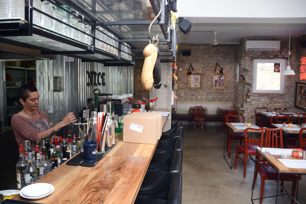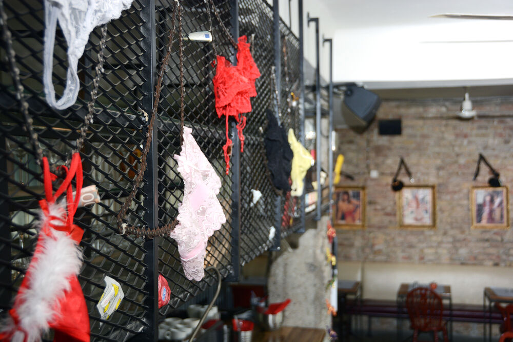 Iznad šanka vise halteri, tangice...nema šanse da ovo ne uočite - ma gde seli...