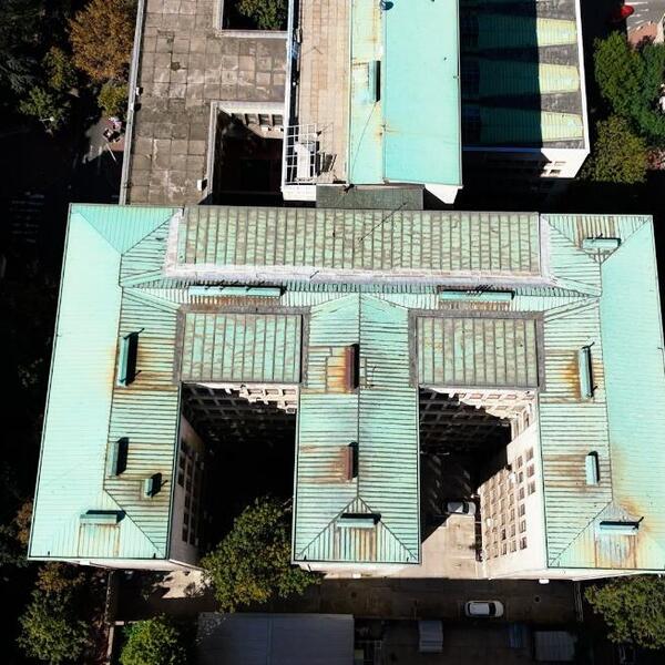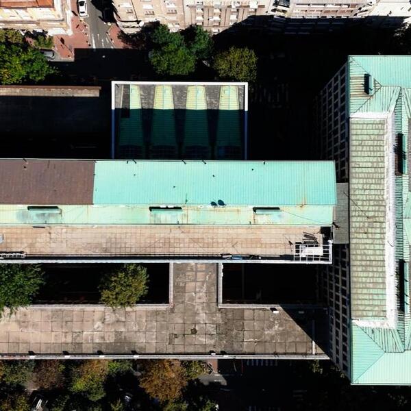 Velika građevina sa nekoliko krakova i dugačkim hodnicima, neobična je i zbog ulice koja prolazi kroz samu zgradu. Ova zgrada je poznata po tome što ako se posmatra iz vazduha, iz takozvane „ptičje perspektive” može se videti njen nesvakidašnji oblik i dva latinična slova „Н” i „E”