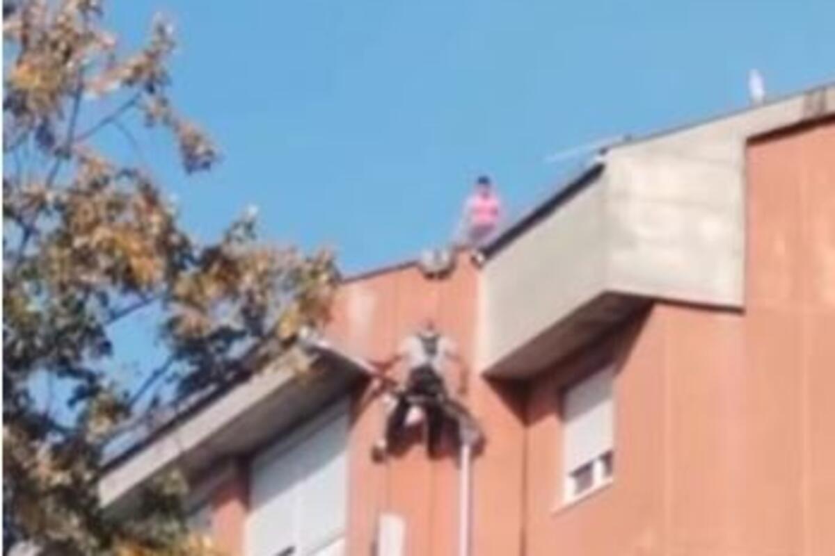 Za sada nije poznato zbog čega se ova žena nalazi na krovu, ali kako se vidi na snimku, muškarac, vezan za sajle, spušta se niz zgradu.