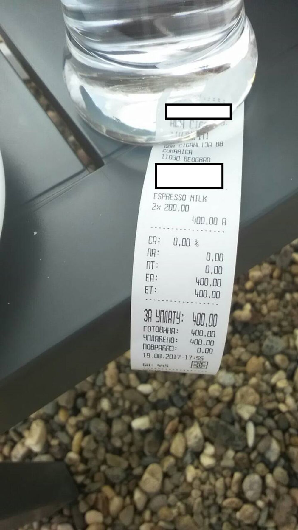- Dakle, sedim sa devojkom, rešimo da pijemo kafu. Espreso. Naručim, ne razmišljajući o tome da će cena biti bukvalno abnormalna. Kada sam zatražio račun, imao sam šta da vidim. 2 espresa 400 dinara!