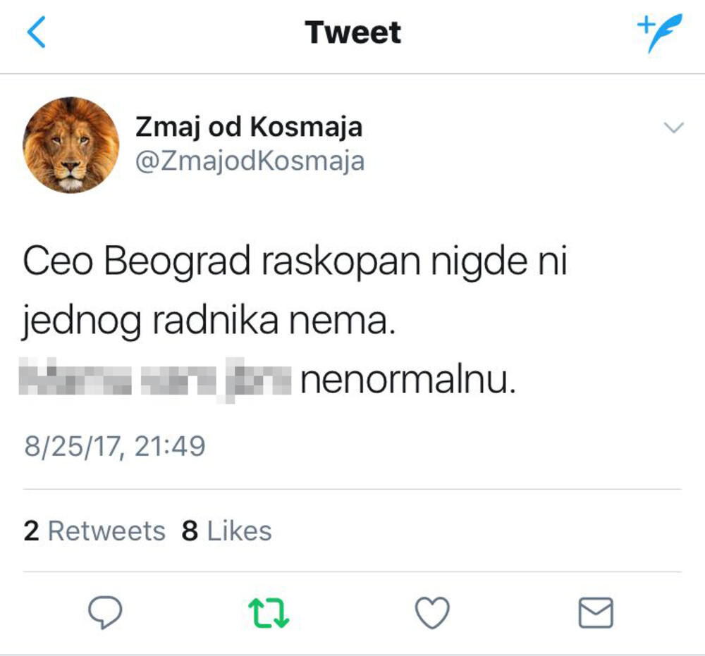 To je z.......nje Beograđana, glase tvitovi, ovakav i na desetine sličnih koji se iz dana u dan množe na društvenoj mreži Tviter.