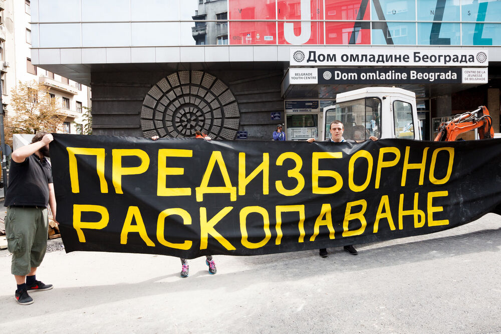 Inicijativa Ne da(vi)mo Beograd današnjom akcijom postavljanja banera “predizborno raskopavanje” želi da ukaže da se gradska vlast ovim služi svojevrsnim trikom kako bi redovne radove na održavanju ulica i fasada, kao i druge građevinske projekte, prikazala kao uspehe u vođenju Beograda na sledećim gradskim izborima.