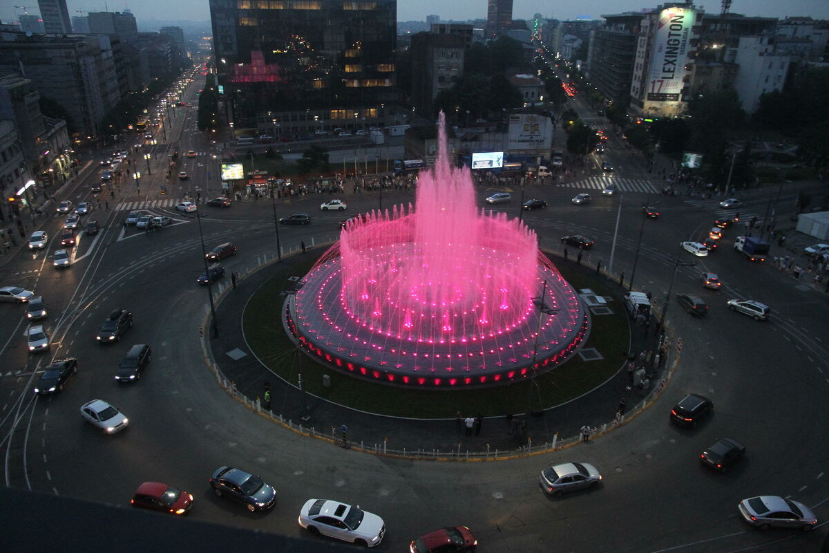 Fontana na Trgu Slavija prostire se na 800 kvadratnih metara vodene površine, poseduje 350 mlaznica i preko četiri stotine reflektora.