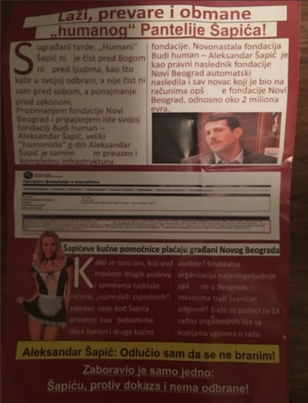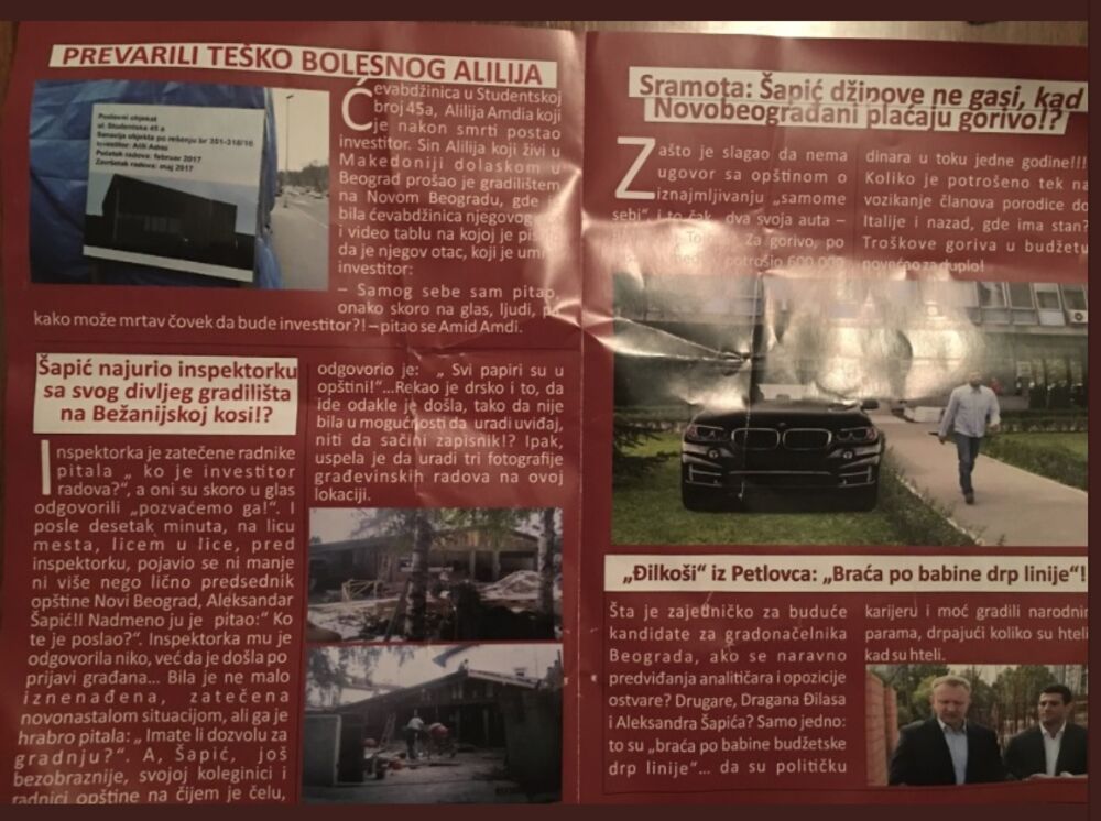 U sandučićima u Sarajevskoj ulici u Beogradu građani su bili šokirani kada su zatekli letke protiv Aleksandra Šapića, predsednika opštine Novi Beograd, i izvesnog kandidata za gradonačelnika Beograda.