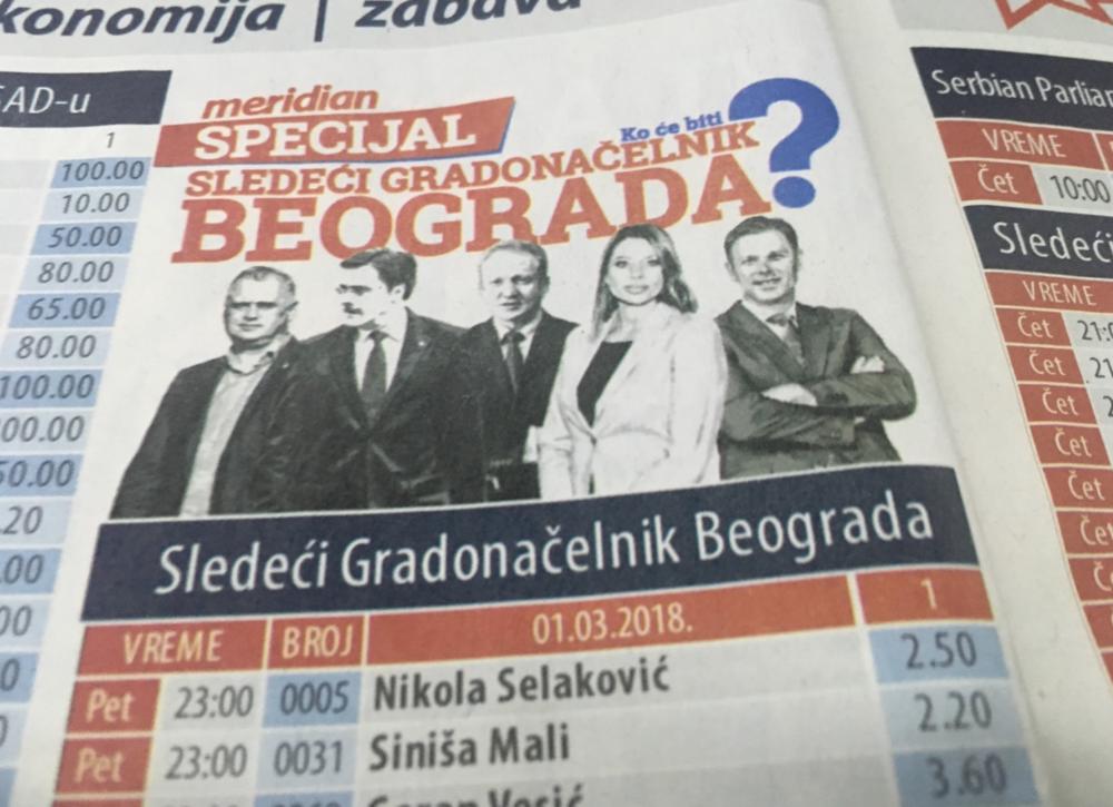 Spisak onih koji nisu na vlasti na republičkom nivou predvodi prvi čovek Opštine Novi Beograd Aleksandar Šapić sa kvotom 4,50, a na 5,50 procenjene su šanse bivšeg gradonačelnika Dragana Đilasa, koji iza sebe ima i podršku Pokreta slobodnih građana Saše Jankovića i Narodne stranke Vuka Jeremića.