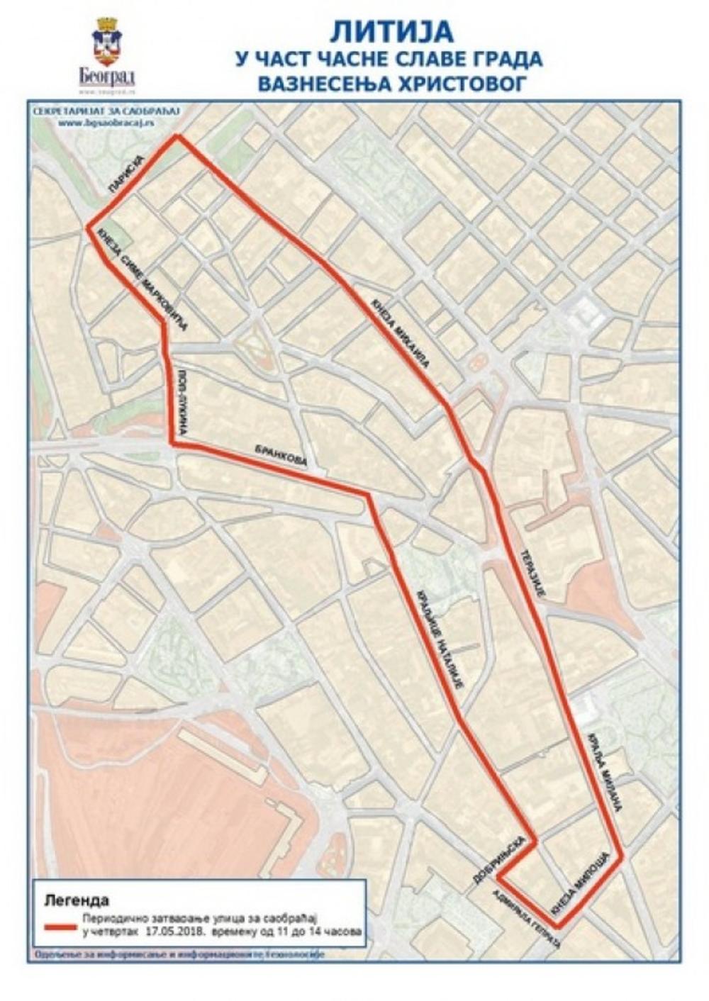 Iz Sekretarijata za saobraćaj mole sugrađane da od 10 do 14 časova, zbog održavanja litije, ne parkiraju svoja vozila u Admirala Geprata (na potezu od Dobrinjske do Kneza Miloša), u Dobrinjskoj (na potezu od Kraljice Natalije do Admirala Geprata), na taksi stajalištu na Terazijama, jer će u suprotnom ona biti uklonjena.
