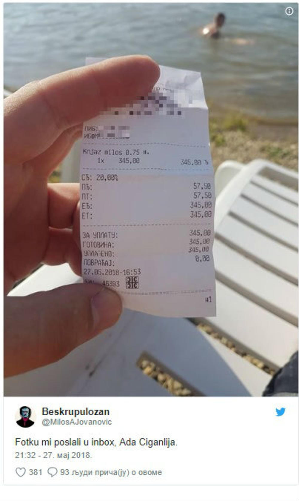 Na Tviteru se pojavila fotografija računa iz jednog lokala na Adi Ciganliji, koja je korisnike društvenih mreža ostavila u čudu. Naime, sudeći po fotografiji, ako želite da popijete kiselu vodu moraćete da izdvojite 345 dinara!