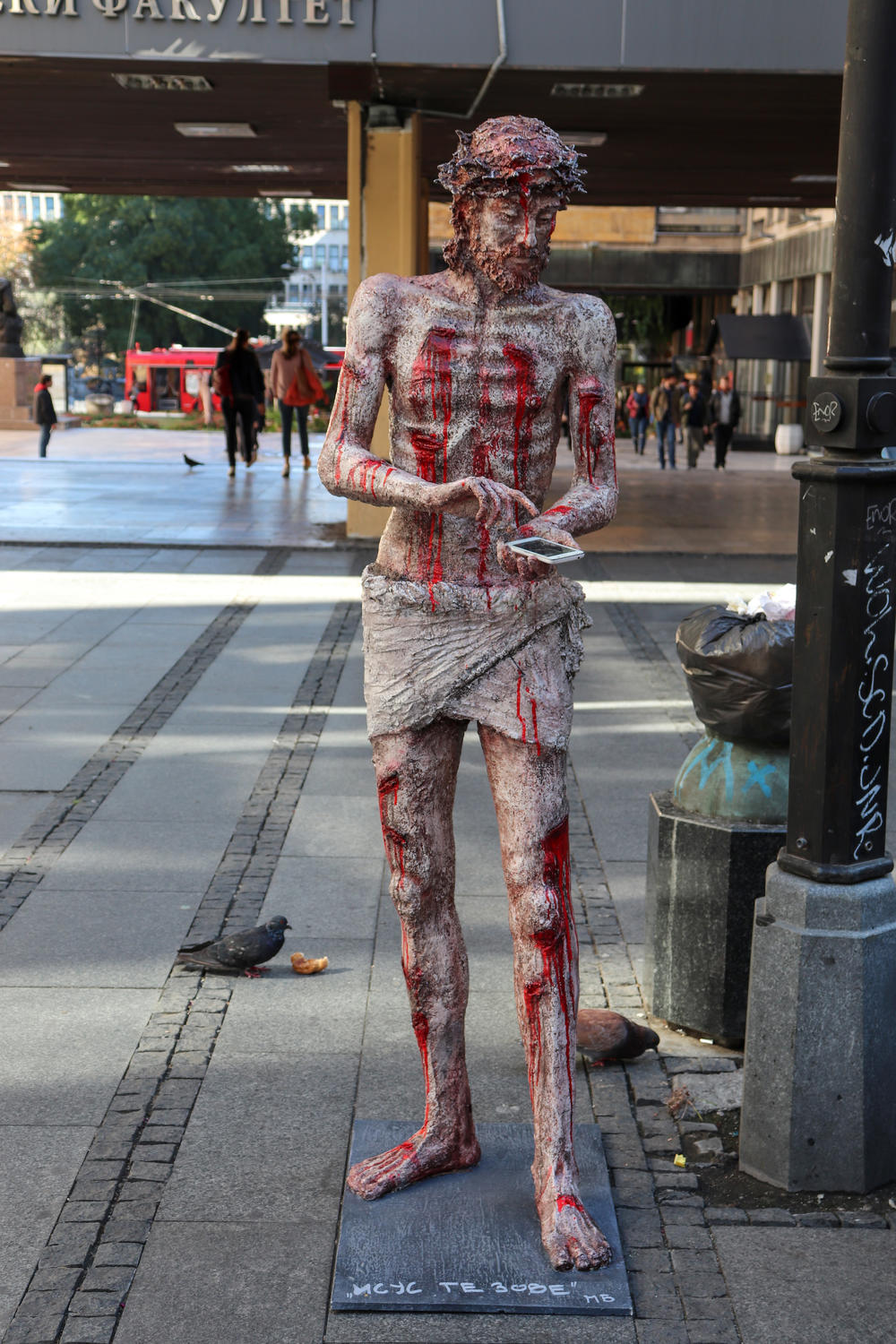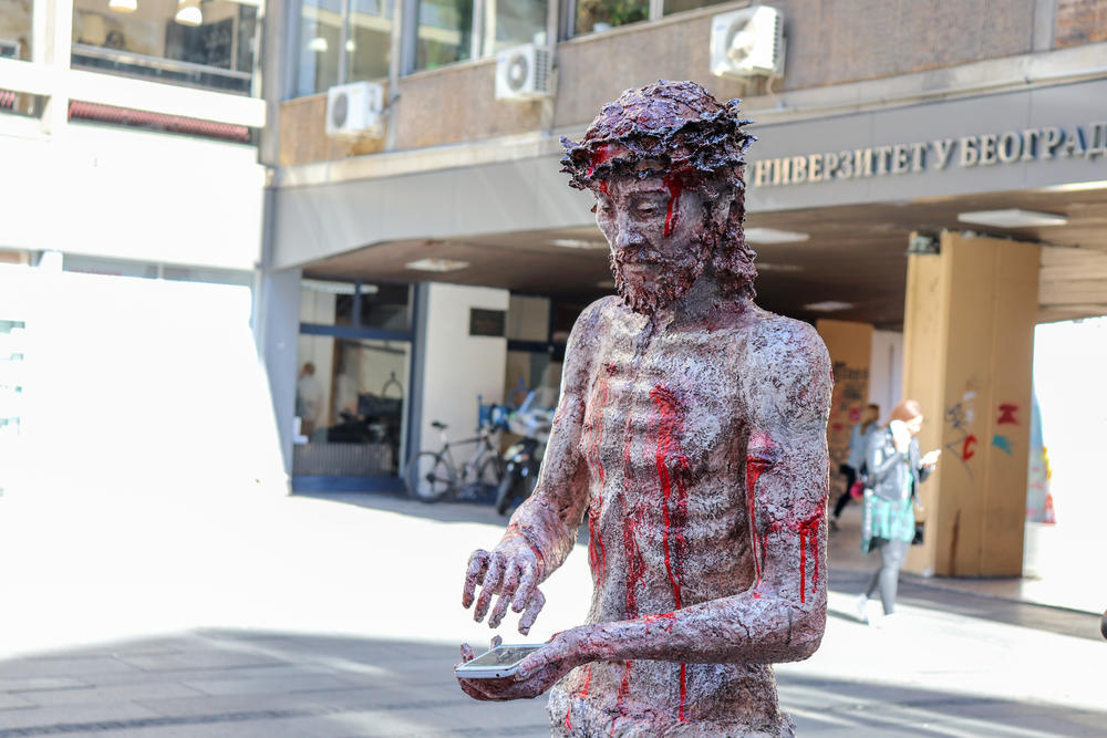 - Isus s mobilnim telefonom u ruci ispred Filozofskog fakulteta. Može li apsurdnije? Ono što me najviše zanimalo je kako će ljudi reagovati. Njihove projekcije mog umetničkog dela su mi još bolje od onog što sam ja zamislio.