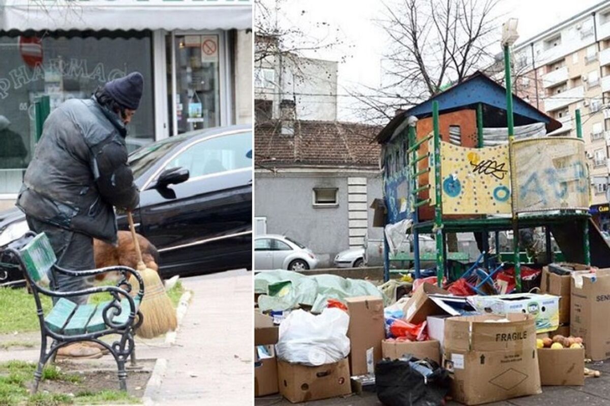 Pored njegovog "dvorišta", koje je do skoro bilo dečiji parkić, nalaze se kontejneri, iz kojih je verovatno i potiče većina njegovih stvari.