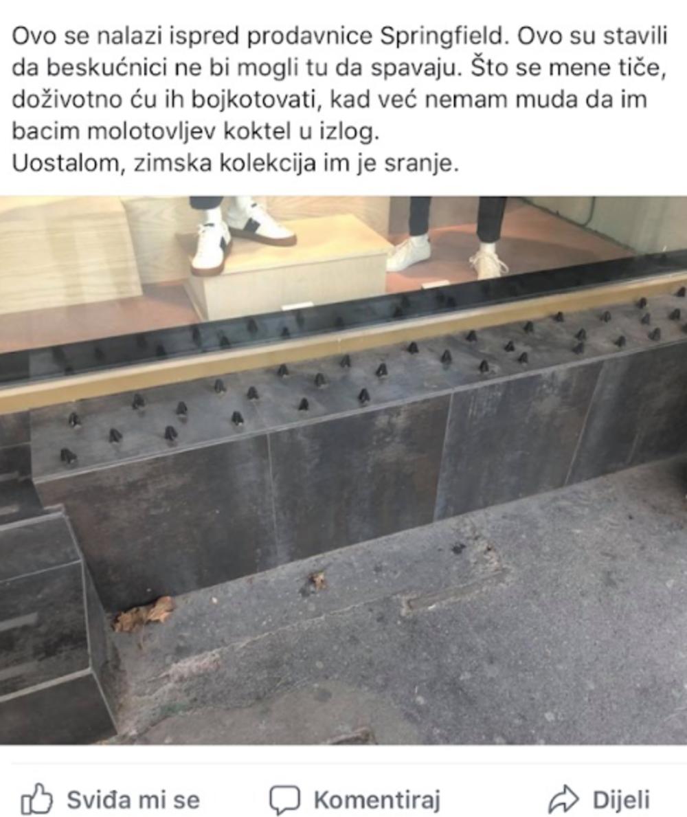 Zbog šiljaka koje je kompanija Springflid postavila ispred svoje prodavnice u Bulevaru Kralja Aleksandra danas su se društvene mreže doslovno usijale. Građani su besni zbog diskriminacije kompanije, pa svoj bes iskaljuju na društvenim mrežama.
