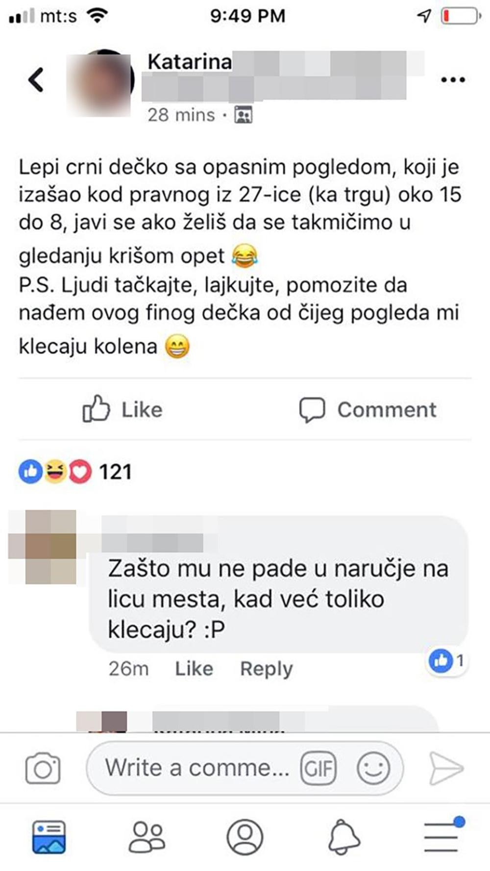 "Lepi crni dečko sa opasnim pogledom, koji je izašao kod Pravnog iz 27-ice (ka trgu) oko 15 do 8, javi se ako želiš da se takmičimo u gledanju krišom, opet :D