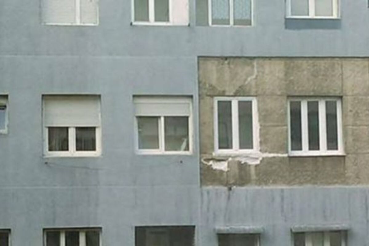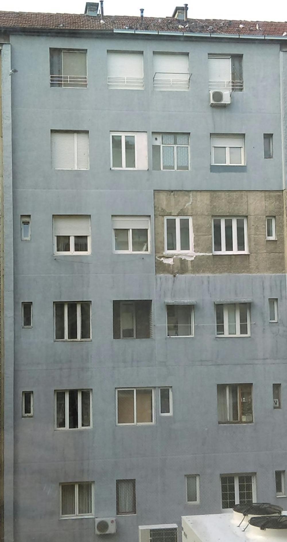 Cela zgrada prekrečena je sivom bojom, a samo oko prozora komšije sa četvrtog beli, goli, betonski zid. Pogledajte na fotografiji.