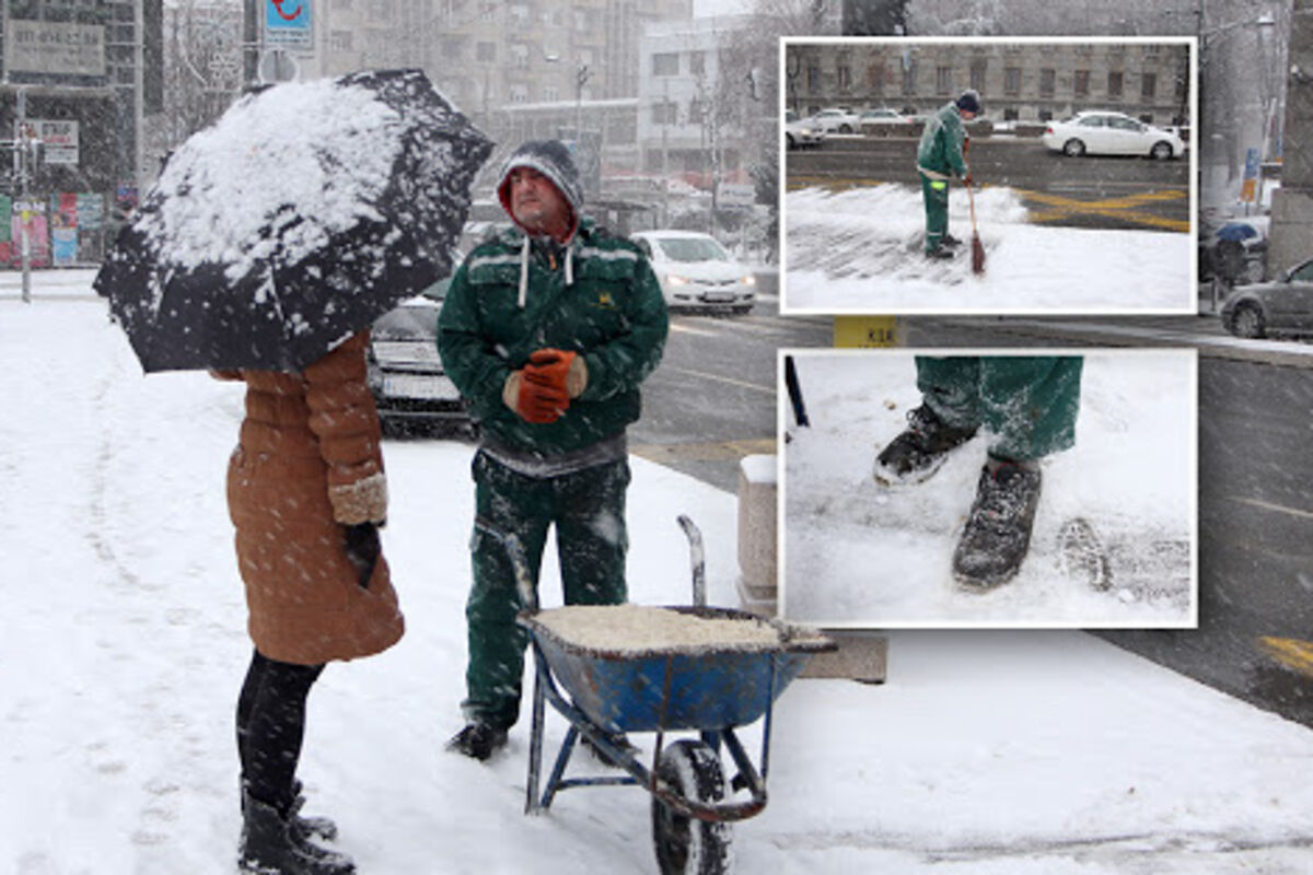 - Radimo puno radno vreme na ulici. Evo nas troje smo jedna ekipa koja radi od 7- 15 h danas. Koleginica čisti, a nas dvojica posipamo so na autobuskim stajilištima - to nam je zadatak za danas. Čistimo i mi. Cipele nam propušaju. Mokre su nam noge i hladno nam je, pa naravno. Prsti otekli, ali nema stajanja. Cipele su nam obezbedili iz JKP, ali su nam potrebne nove, nisu bre ove za sneg uopšte - kaže radnik beogradskog zelenila, dok drugi gura noge da slikam i njegove plitke cipele.