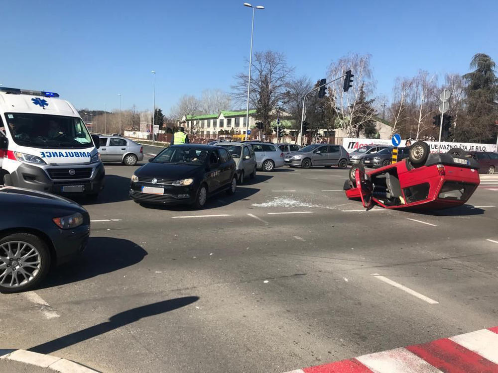 U Novom Beogradu, na raskrsnici Omladinskih brigada i Heroja s Košara, u blizini Erport sitija danas je dogodio pravi karambol kada se fijat panda prevrnuo na krov!
