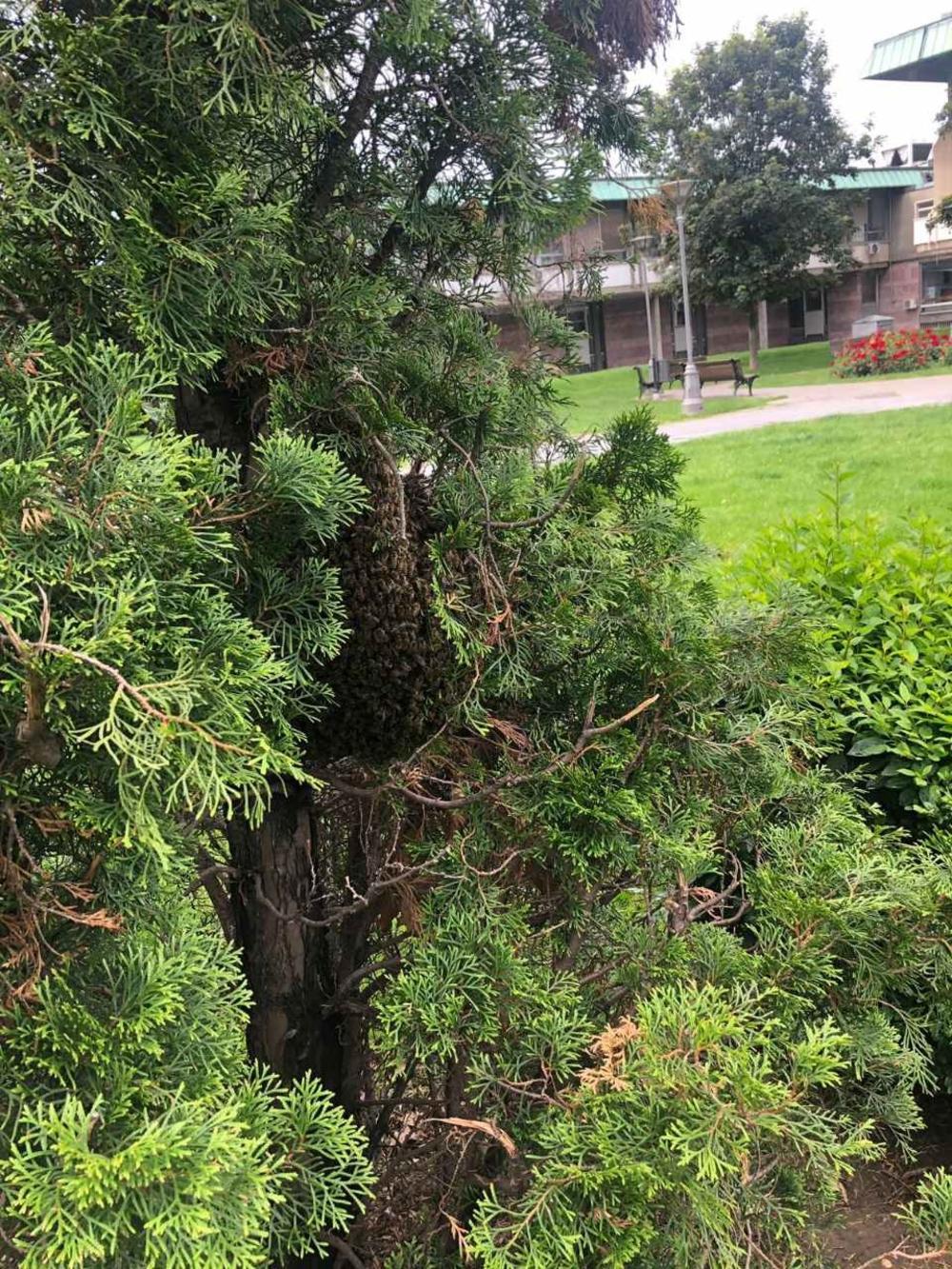 Na drvetu u Karađorđevom parku u neposrednoj blizini Hrama Svetog Save zakačio se roj pčela, koji predstavlja opasnost po prolaznike, a naročito za malu decu, pošto se nalazi prilično nisko.
