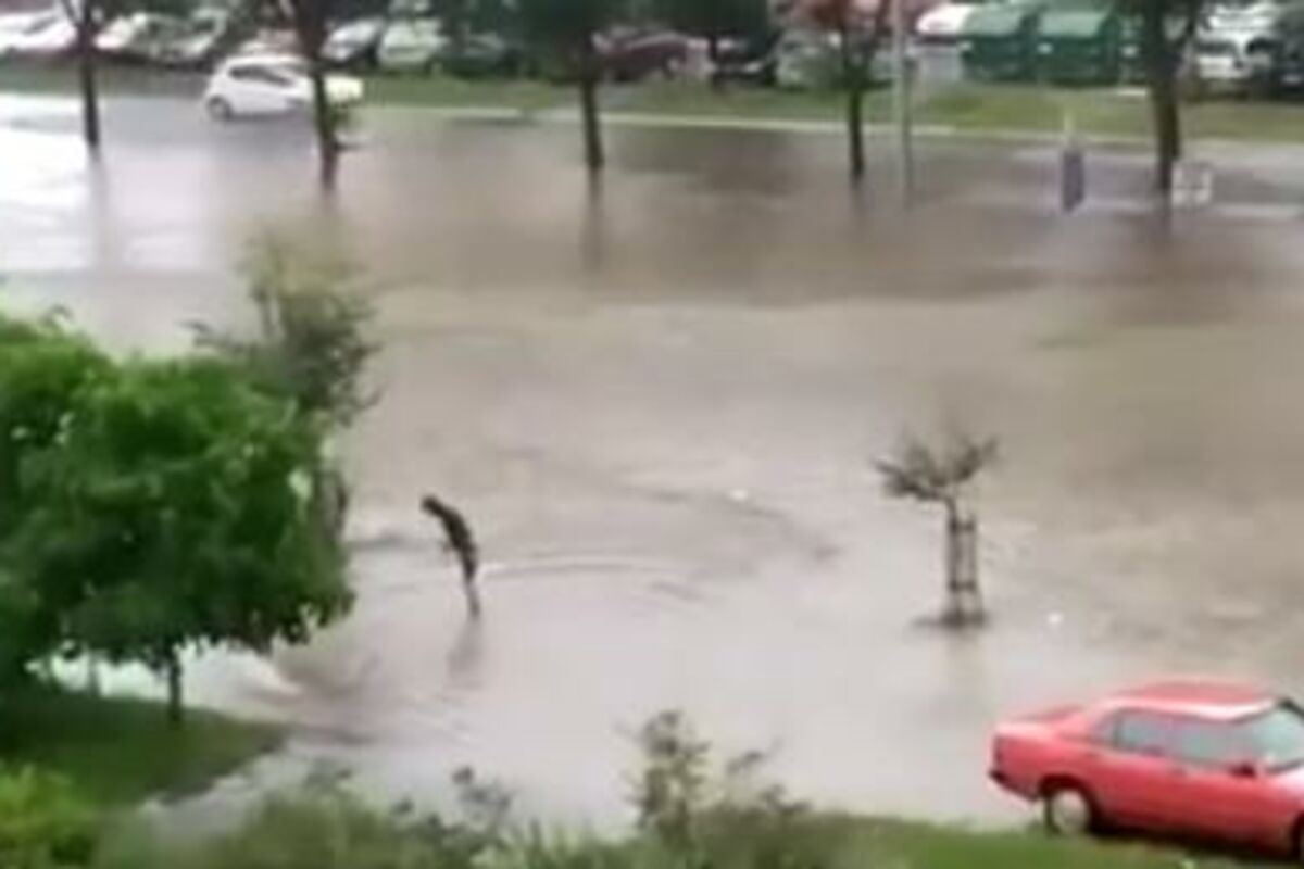 Međutim, u toku vodene bujice jedan mladić se dosetio da sebi ulepša kišni dan i iskoristio nepogodu za njemu, verovatno, omiljeni sport.