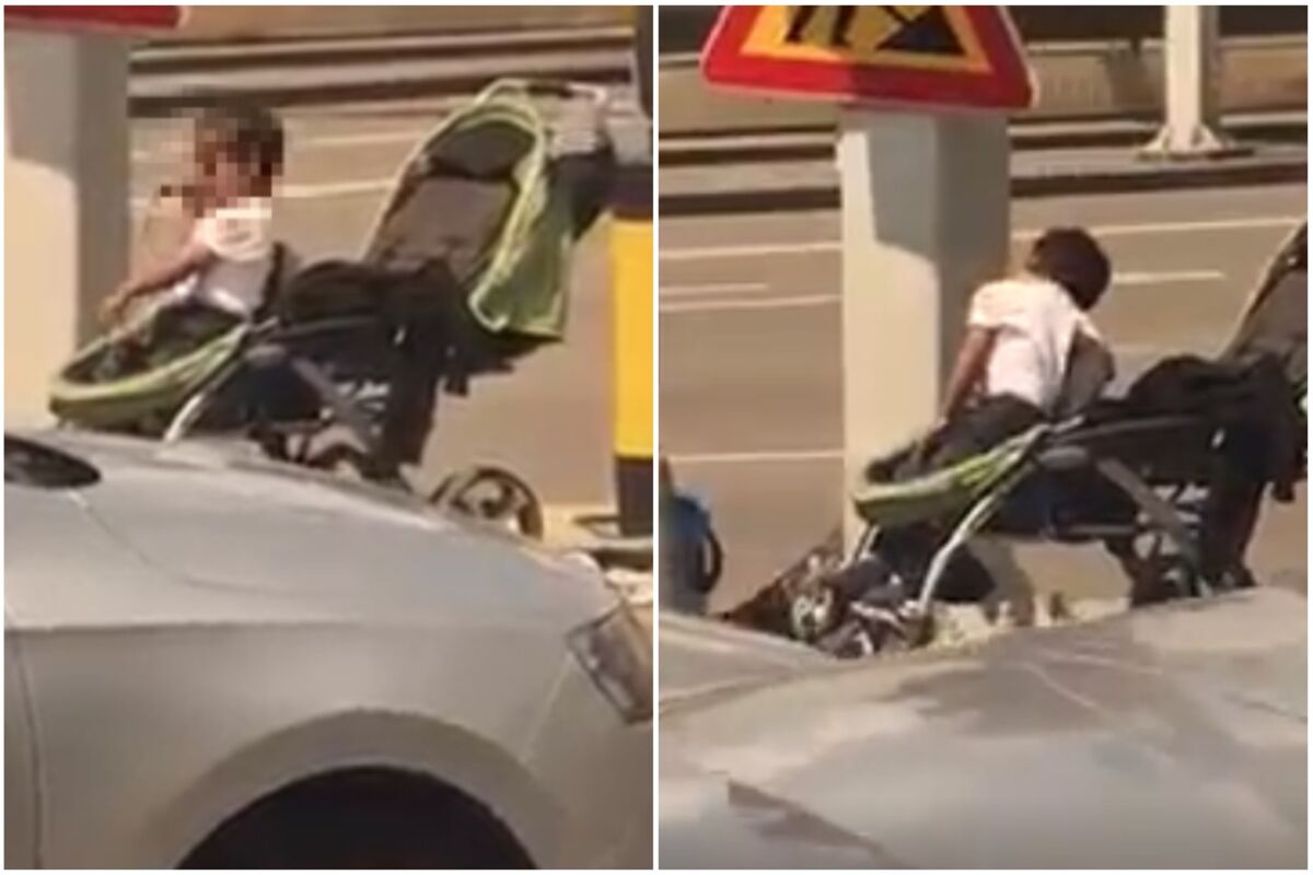 Na fotografijama se jasno vidi da je dete, svega nekoliko godina staro, u kolicima na sred puta