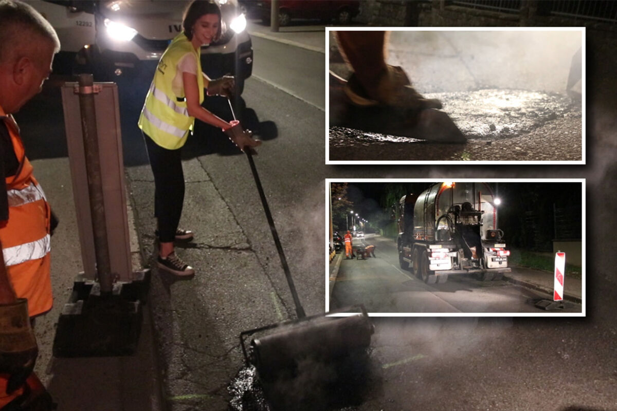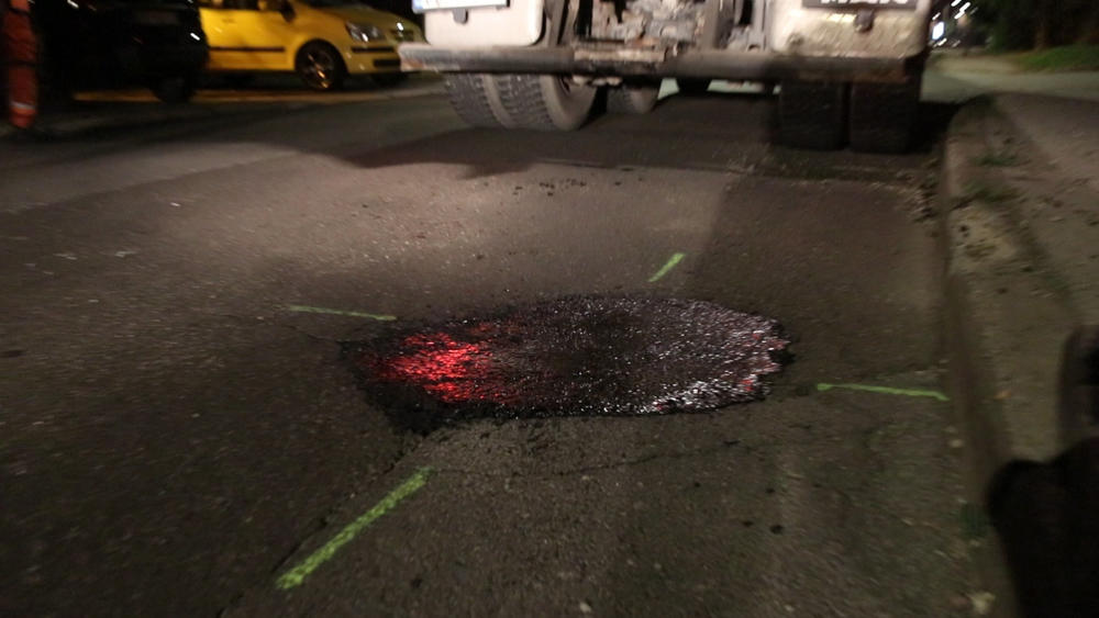 Kada je ulica bila lepo obezbeđena pristigao je i kamion u kom se nalazio asfalt. Ova smesa,sa kojom putari rade svakodnevno je vrlo opasna jer se greje na 250 stepeni kako bi bila meka da se uklopi u rupu, a kada se ohladi i očvrsne prirodni uslovi ne mogu ponovo da je zagreju do promenljivog stanja.
