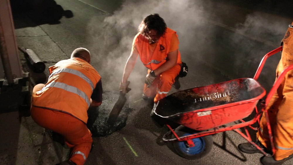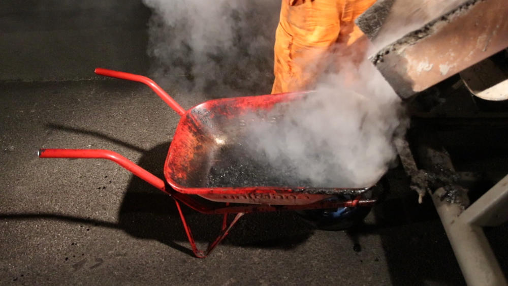 Zaštićeni rukavicama putari su pažljivo smesu iz kamiona prebacili u metalna kolica pa zatim na samu ulicu. Sledeće je trebalo poravnati novu smesu kako bi se savršeno uklopila u ostatak puta i popunila prijavljeni problem - a to se radi ručno. Radnici su metalnim plugama uglačavali užareni asfalt do savršenstva.