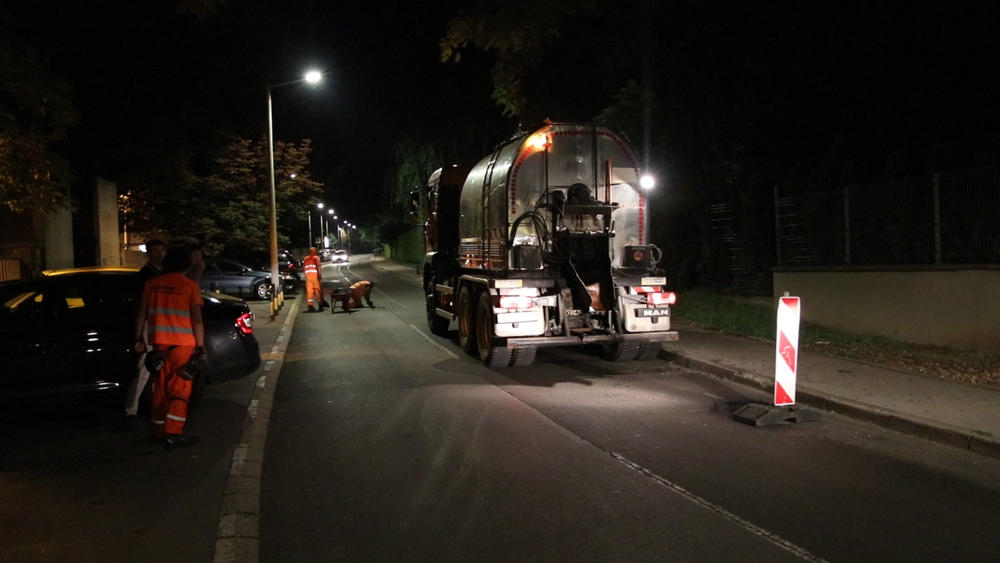 U 10 časova smo se nalazili kod ulaza u Vojnu akademiju i čekali ekipu Beograd Puta da pristigne. Iz prvog kamiona koji je došao izašla su petorica putara obučena u jarko narandžaste boje. Sam kamion je na sebi imao dosta svetala, a prikolica koja je bila zakačena iza njega nosila je velike svetleće znakove. Jedan znak su postavili na početku same ulice, a sa drugim otišli do rupe koju je trebalo popuniti.