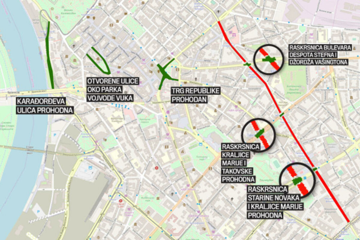 Tokom izvođenja radova na rekonstrukciji i uređenju saobraćajnica u ulicama Kraljice Marije, 27. marta, Džordža Vašingtona i Cara Dušana u postojećoj regulaciji do ponedeljka, u četiri sata ujutru, biće zatvorena za saobraćaj raskrsnica Bulevara despota Stefana i Džordža Vašingtona.