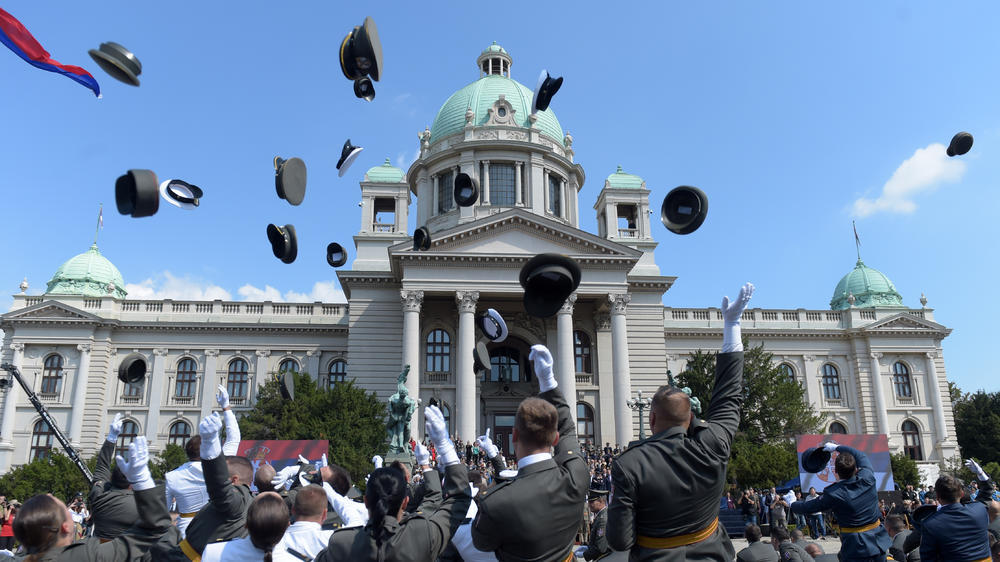 Posle svečanog defilea i naleta MIG aviona, oficiri su bacili šapke uvis.